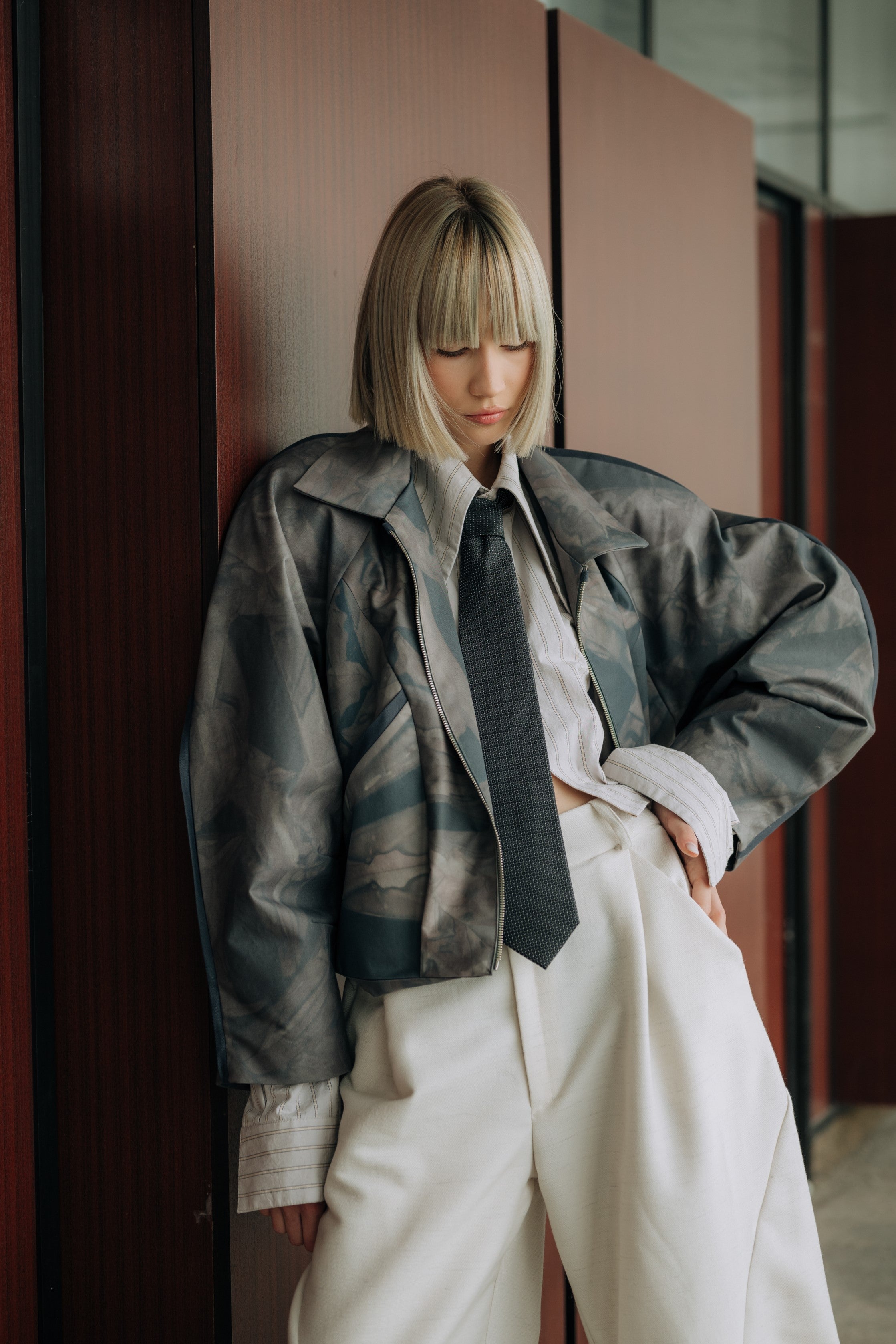 Bomber jacket in printed cotton and navy accent details. Featuring rounded voluminous sleeves and shoulders, front pockets and silver zipper.