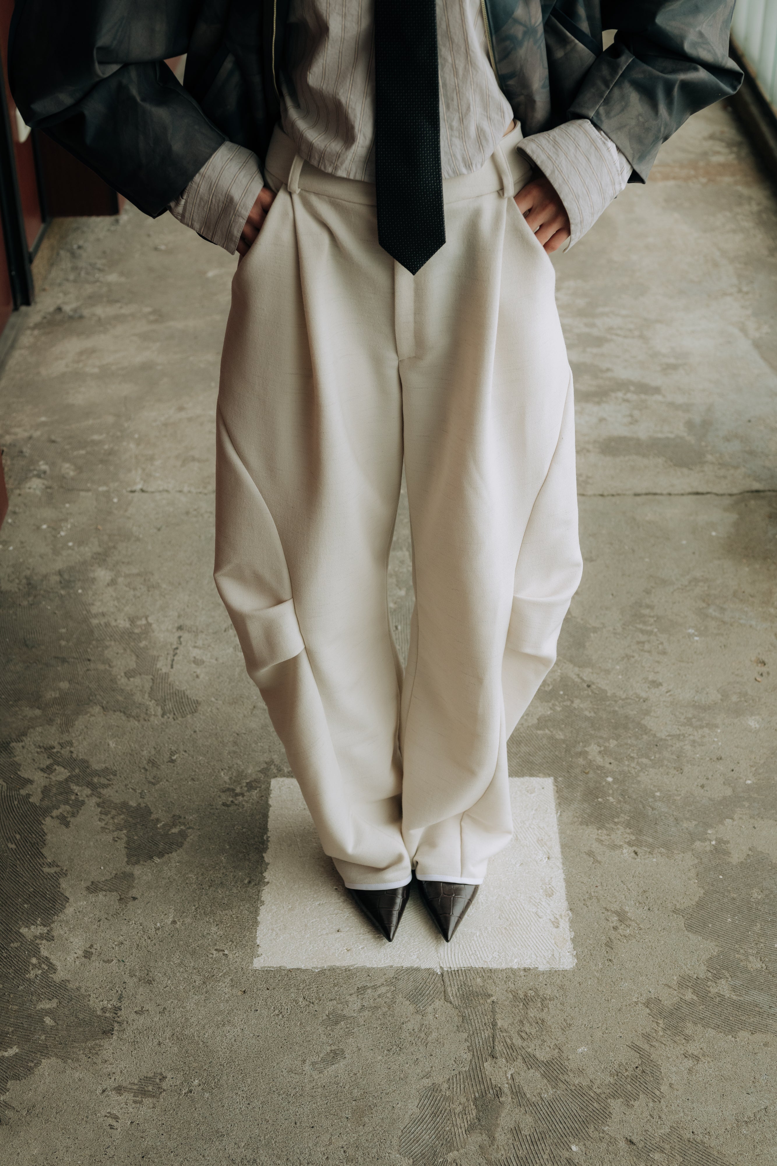 High waist barrel leg pants, made in milky-grey marl fabric. Featuring interesting cut with small knee pleats, this model forms a unique silhouette.