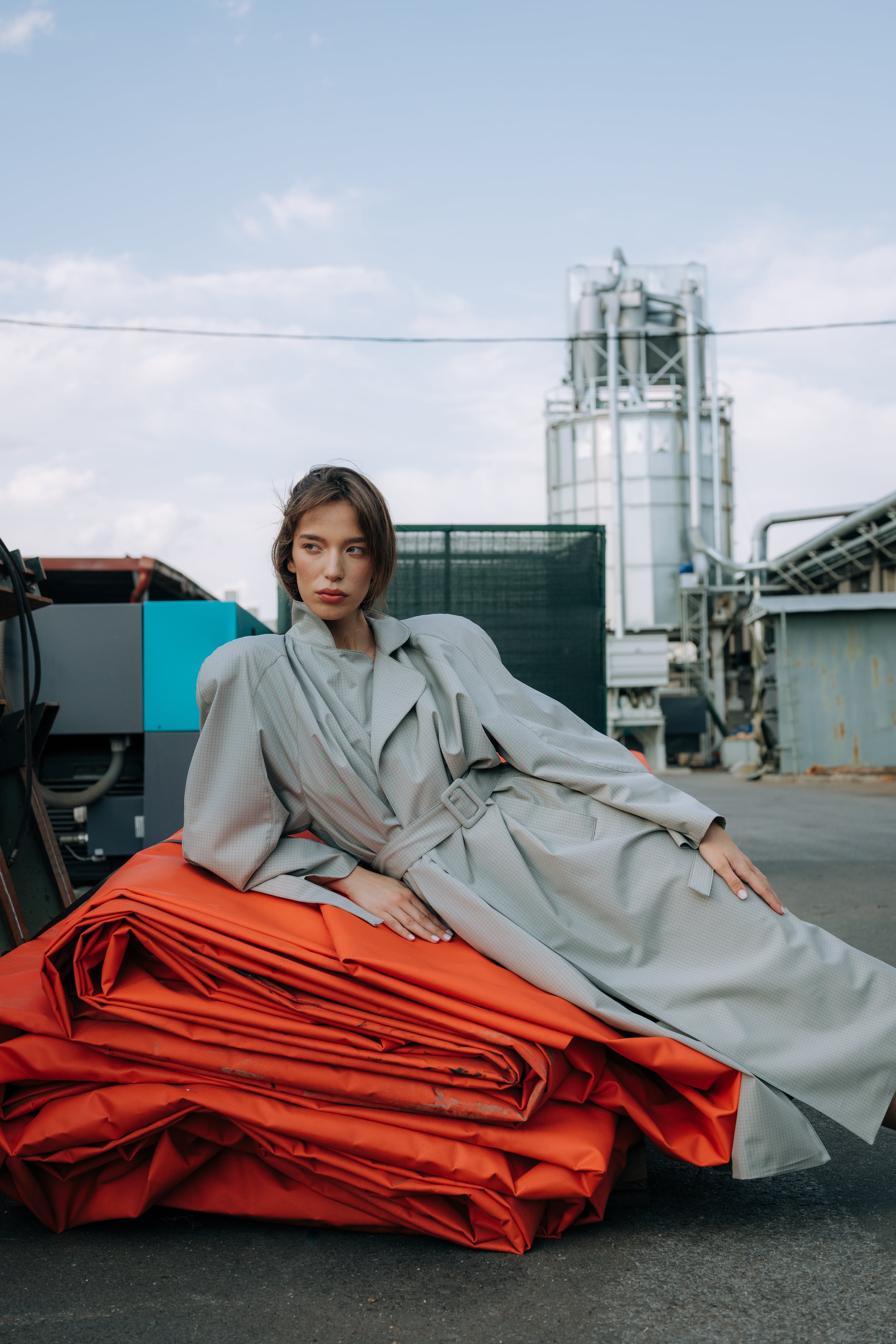 Long oversized waterproof trench coat, with rounded voluminous shoulders, and high collar.