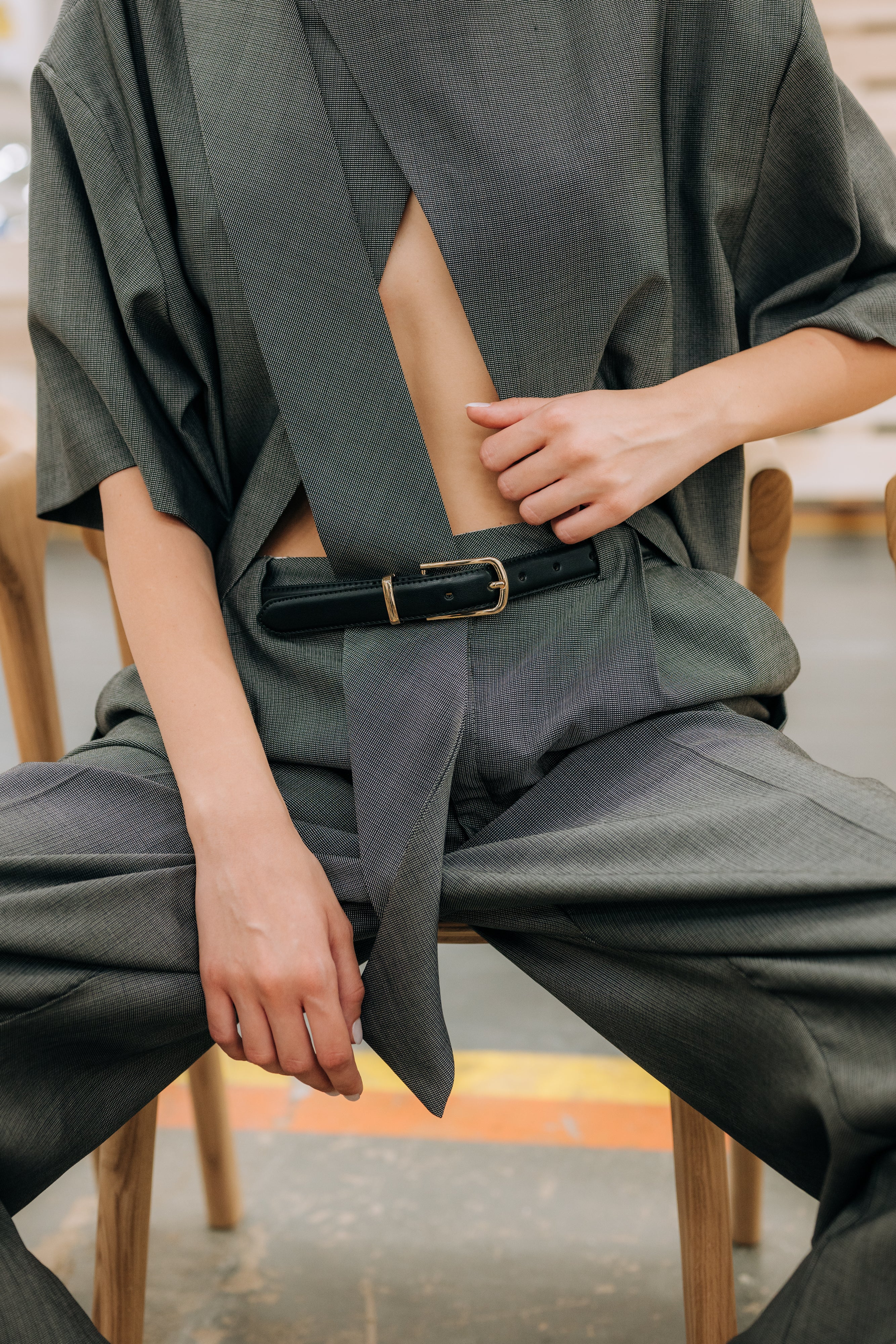 Long, slightly oversized coat, made of alpaca wool in anthracite color. Soft and warm with bold lapels, hidden pockets, attached belt and two buttons for fastening in two different width.