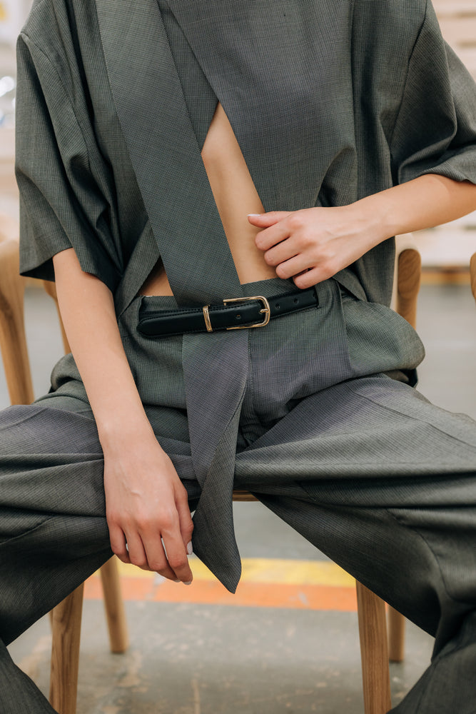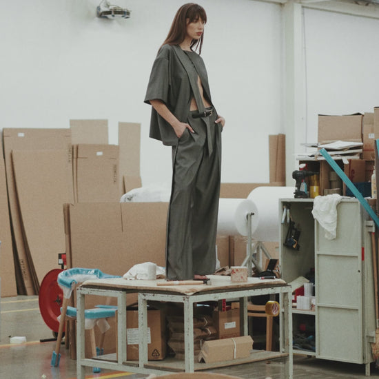 Pants are high waisted with front pleat, belt loop detail and side stripe in same fabric. T-shirt has an overized fit, with short sleeves and scarf collar, and an open back, that you can also wear in reverse, in front.