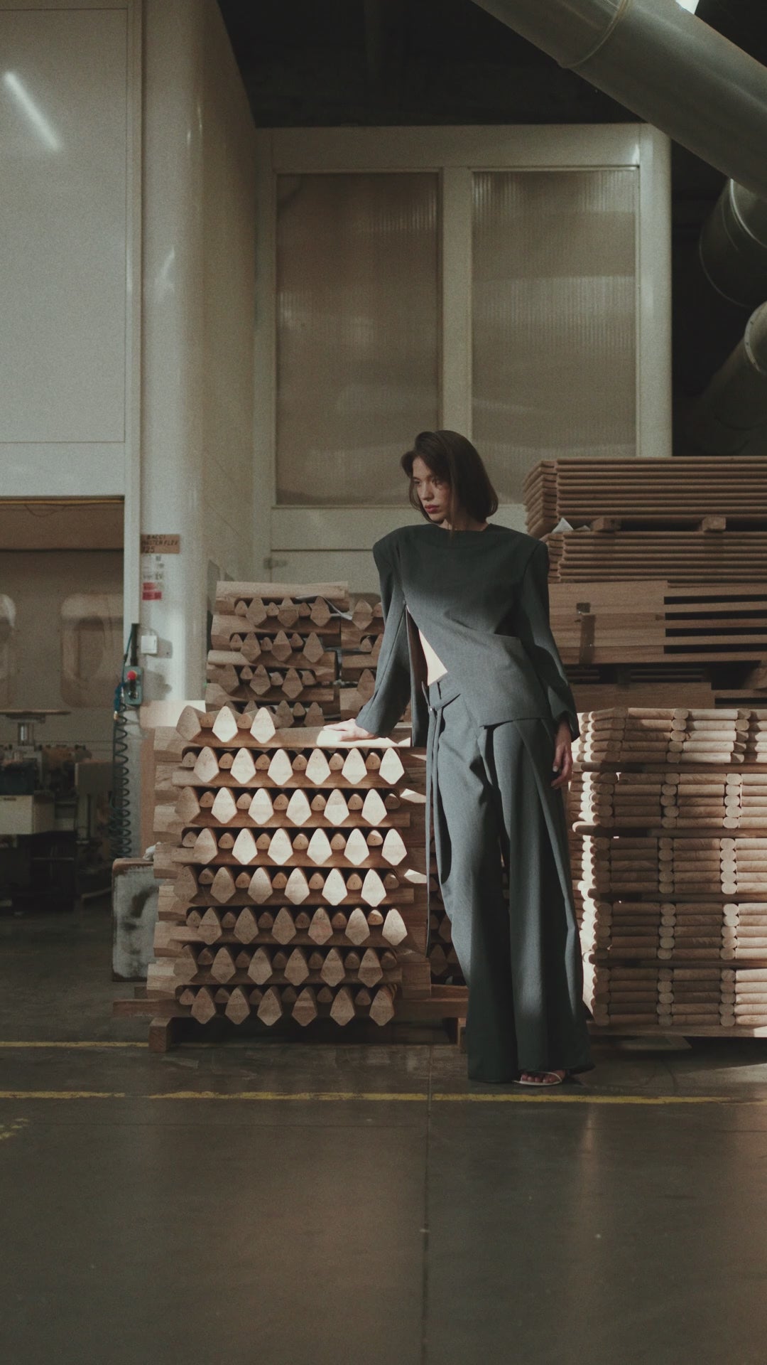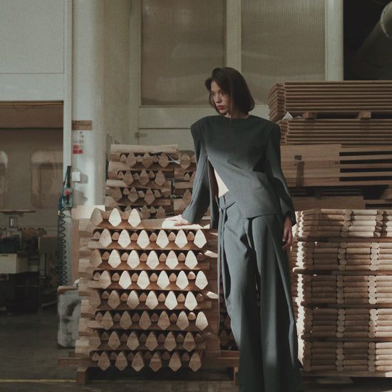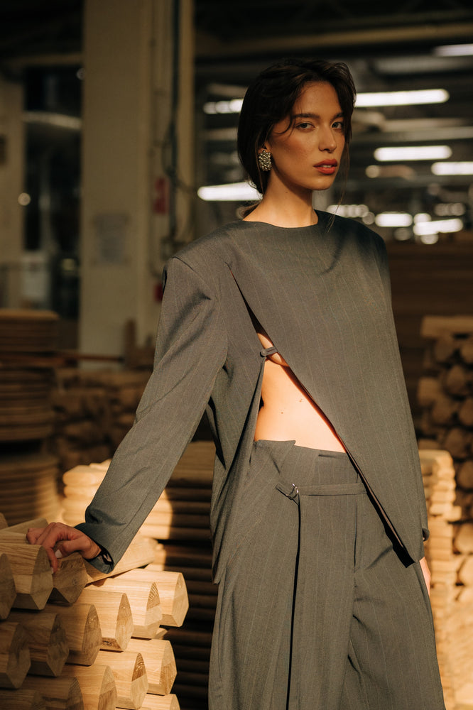 Oversized closed blazer, with enhanced shoulders, and side cutout. Made in navy pinstripe wool fabric.